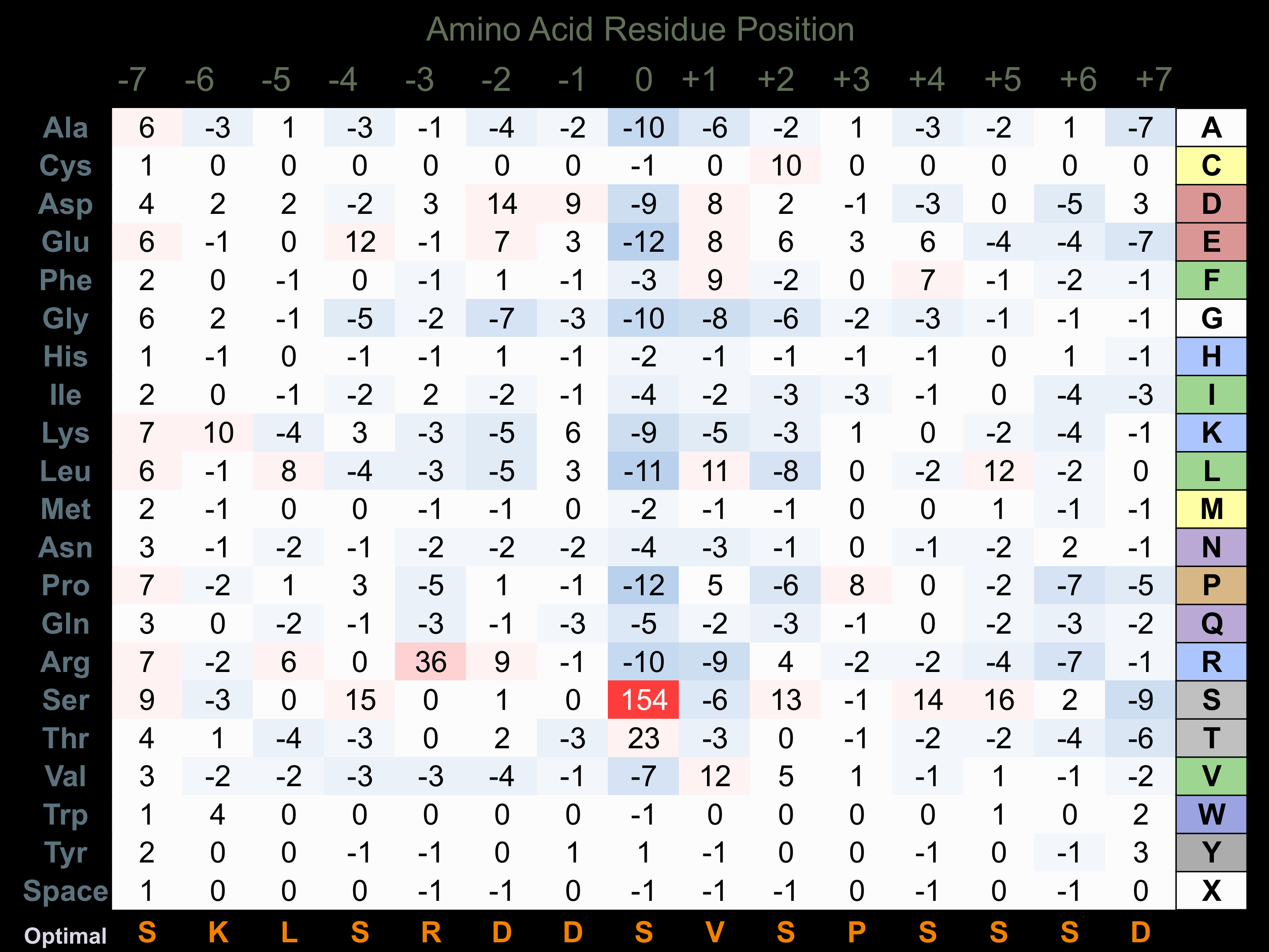 Matrix of observed frequency (%) of amino acids in aligned protein substrate phosphosites