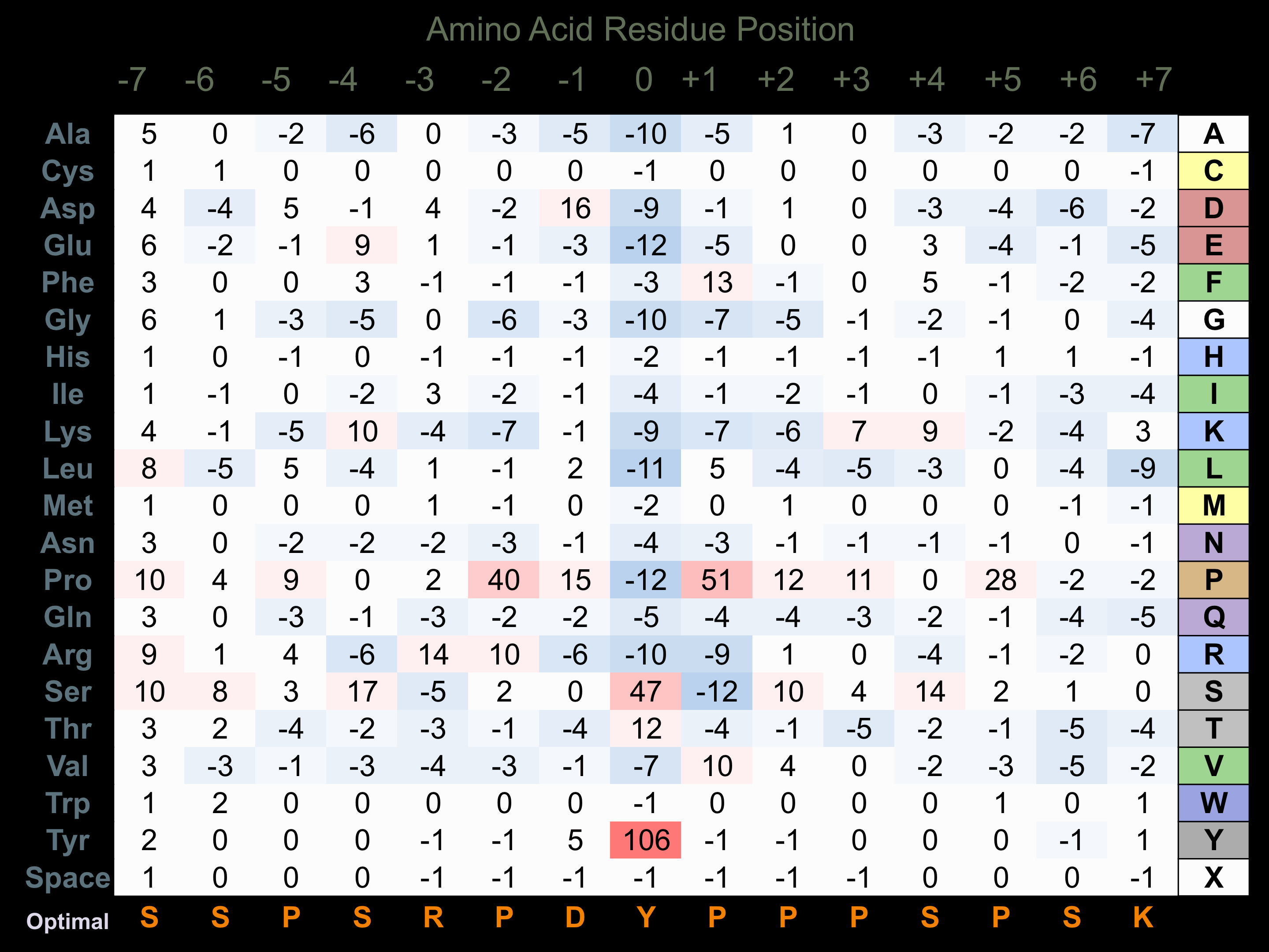 Matrix of observed frequency (%) of amino acids in aligned protein substrate phosphosites