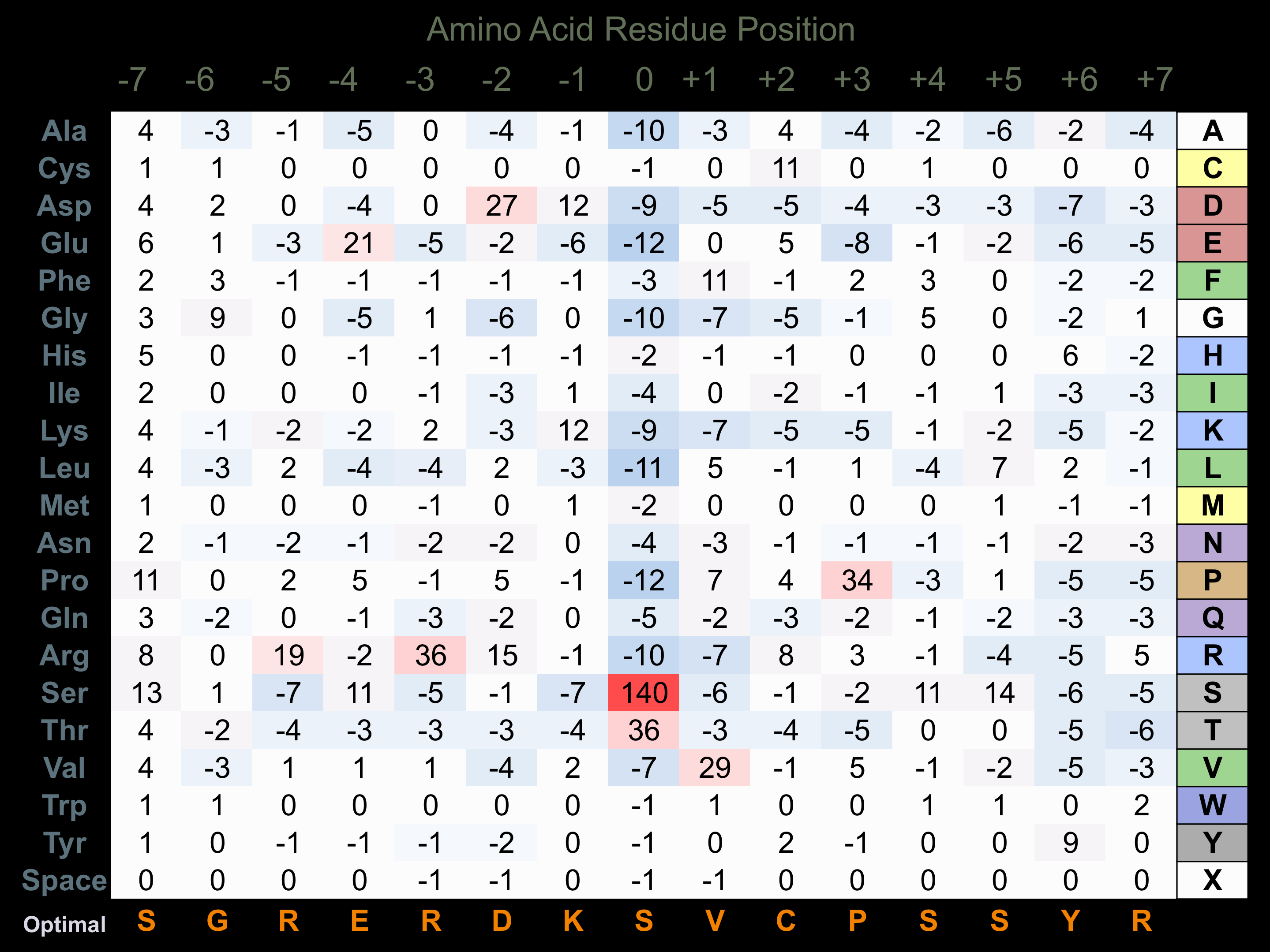 Matrix of observed frequency (%) of amino acids in aligned protein substrate phosphosites