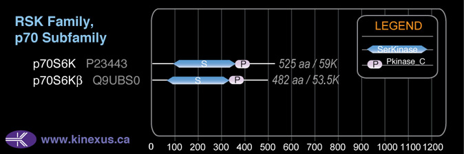 The COSMIC website notes an up-regulated expression score for p70S6Kb in diverse human cancers of 563, which is 1.2-fold of the average score of 462 for the human protein kinases. The down-regulated expression score of 21 for this protein kinase in human cancers was 0.4-fold of the average score of 60 for the human protein kinases.